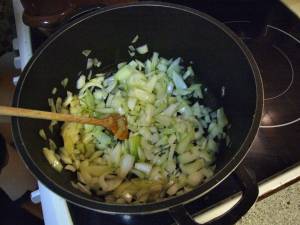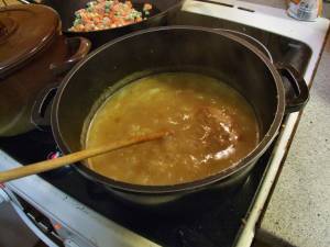2. Přilijeme libovolné množství vody s rozpuštěným masoxem, podle toho, kolik polévky děláme. Počkáme až voda v hrnci začne vařit.
