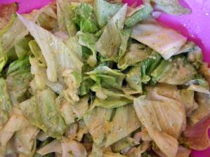 Hlávkový salát omyjeme, listy roztrháme na menší kousky. V salátové míse si připravíme směs, kterou důkladně vidličkou promícháme (našleháme). Do směsi pak vmícháme připravený salát.