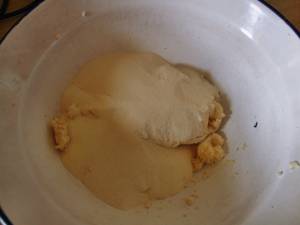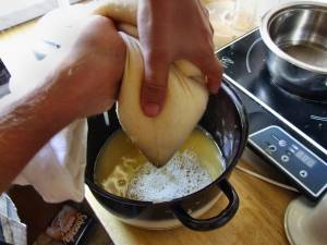 Až to vokape, tak se tám přidá hrubá mouka, sůl a vajíčko. Pokud se to s tou moukou přežene, tak jsou pak ty hotový vařený šlejšky tvrdý jako broky.