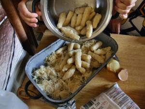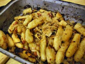Jednodušší varianta je s bramburovejma knedlíkama z pytlíku. Z těsta uděláme štyry hady a nakrájíme je na malý kousky, tak 3–4 cm. Dáme vařit, jak vyplavou, tak je scedíme, ve vymaštěným pekáči smícháme se zelím a dáme péct při 200°C na zhruba 30 min. Během pečení to mušíme párkrát promíchat.