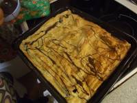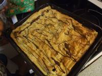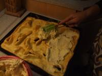 Svaříme a necháme vychladnout. Pak přidáme 6 celých vajec. Rozdělíme na dva plechy, hodně vymazat sádlem. Pečeme při teplotě 200°C maximálně 20 minut (ale spíš míň). 10 minut neotvírat troubu.