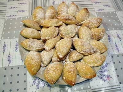 Smícháme mouku s rozkrájeným změklým tukem a tvarohem a vypracujeme hladké těsto. Těsto rozválíme na plát a taštičkovačem vykrajujeme kolečka, lžičkou vložíme náplň, přehneme a zmačkneme okraje. Hotové taštičky naskládáme na plech s pečícím papírem, potřeme rozšlehaným vajíčkem a pečeme do zlatova (170-180°C, cca 10 min.).