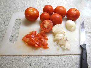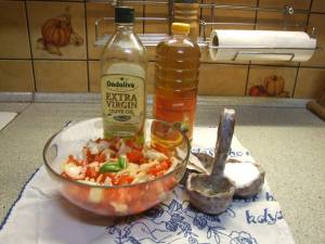 Nakrájíme na kostičky rajčata i cibuli, vhodíme do mísy a promícháme. Zakápneme olej a ocet podle chuti. Přisypeme sůl a další možné bylinky (bazalka, tymián, oregáno).