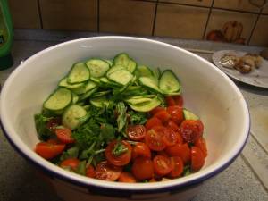 Listy rukoly omyjeme, pokrájíme na kousky a dáme do mísy, kam ještě přidáme na kolečka pokrájenou salátovou okurku, rajče (vhodná jsou i chery rajčata rozkrojená napůl), papriku, dobrá je i nastrouhaná mrkev. Zeleninu promícháme, zakapeme olivovým olejem, na okyselení můžeme použít buď ocet,vinný ocet nebo citrón, lehce osolíme a můžeme podávat.