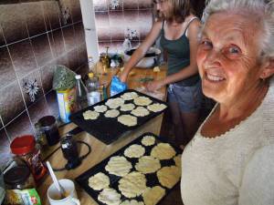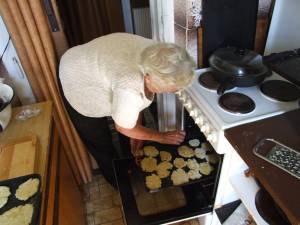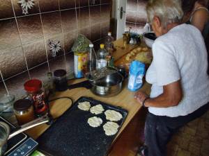 Z vařenejch bramburů se udělají placky – přidá se do nich jenom mouka a sůl. To těsto musí bejt, aby z toho šly válet placky. Placky se upečou, jenom tak na sucho, pak se spaří s vařící vodou. To se veme jenom vařící voda a tu placku tám jenom tak vycouráš, aby byla vláčná. Ty placky se musí spařit, protože pak sou takový hebký.