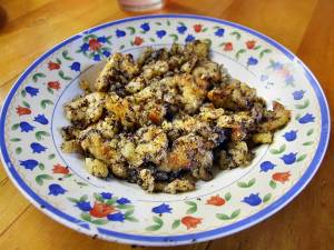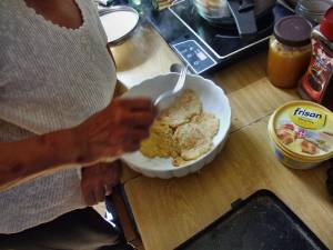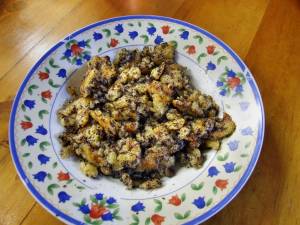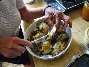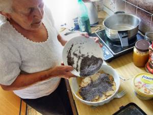 Pak se roztrhá na kousky a posype se mákem, kerej se rozemele a smíchá s cukrem. Máma to dávala do jedný mísy a polejvala to eště máslem. Z tý mísy si to pak každej nabral na talíř a měli sme k tomu sladký mlíko.
