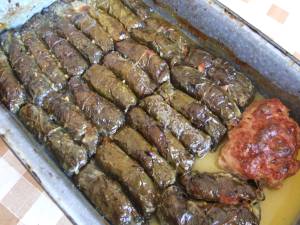 Uděláme masové bobky, které zabalíme do listu. Vymastíme pekáček (sádlem, Herou…) a rolky na sebe těsně naskládáme. Pečeme zhruba 3/4 hodiny na 180°C.